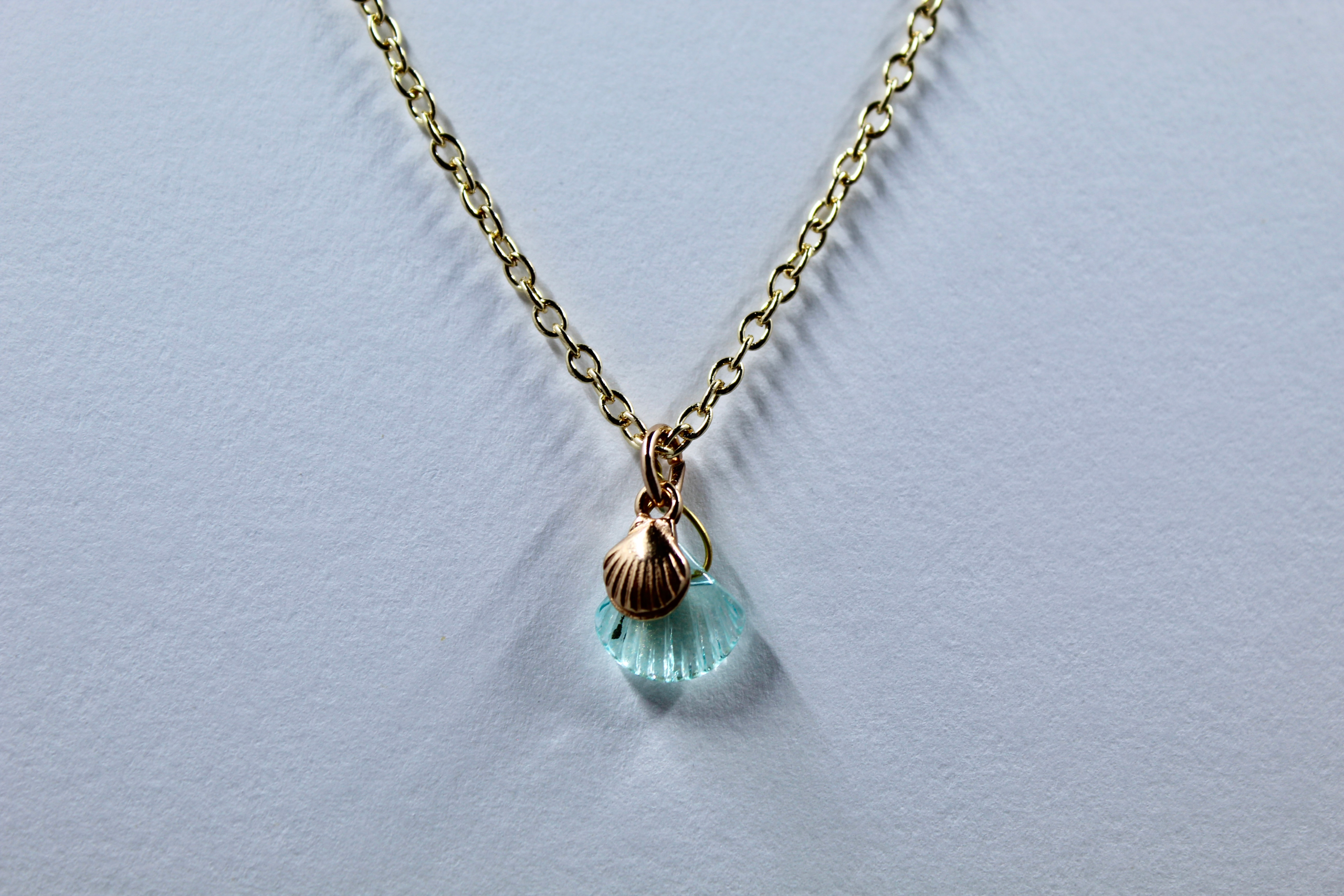 Design: The necklace features a small, finely detailed gold-tone seashell charm paired beautifully with a stunning faceted aqua blue glass bead. The transparent blue bead resembles a drop of crystal-clear ocean water, giving the pendant a wonderful sense of light and movement.