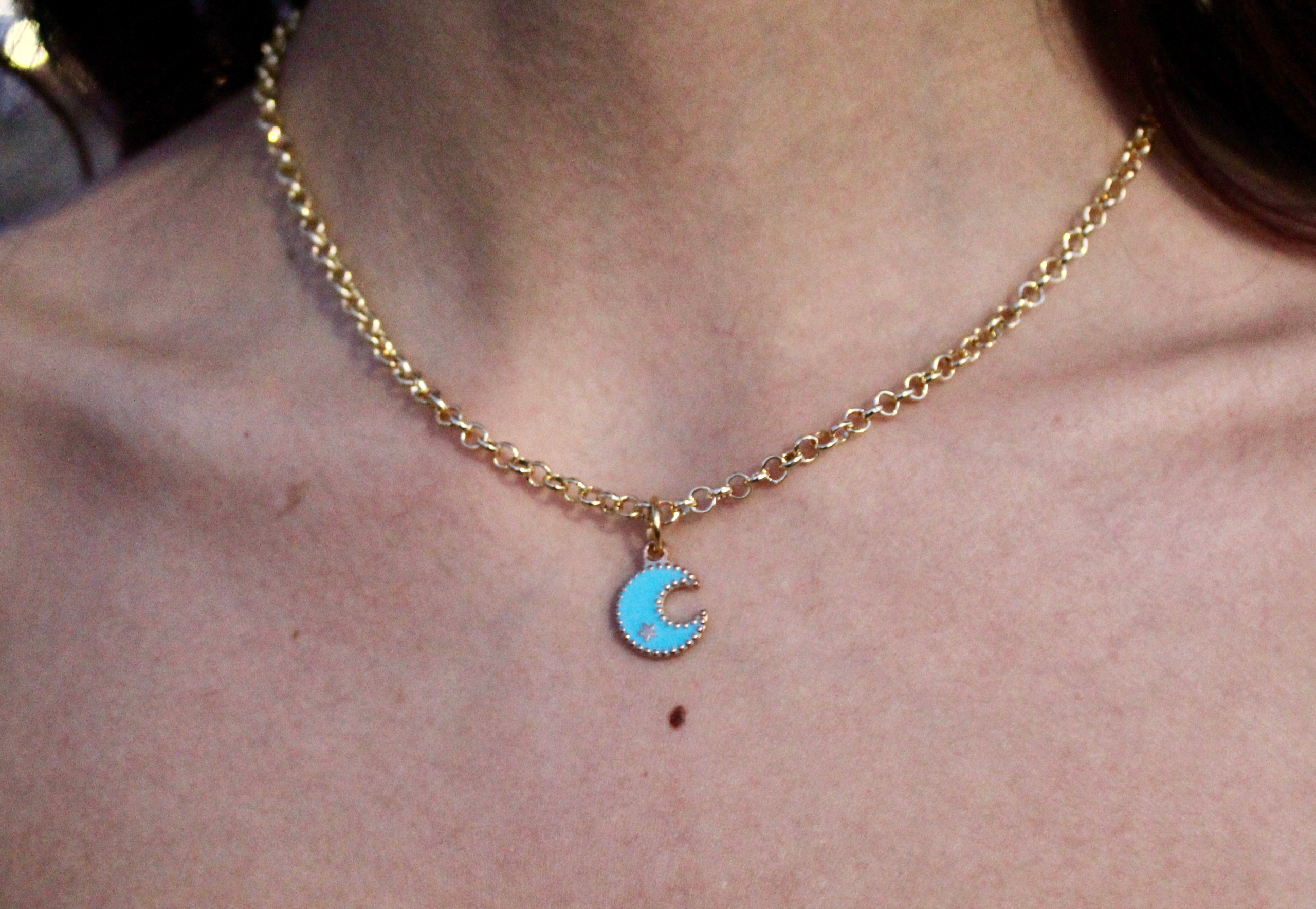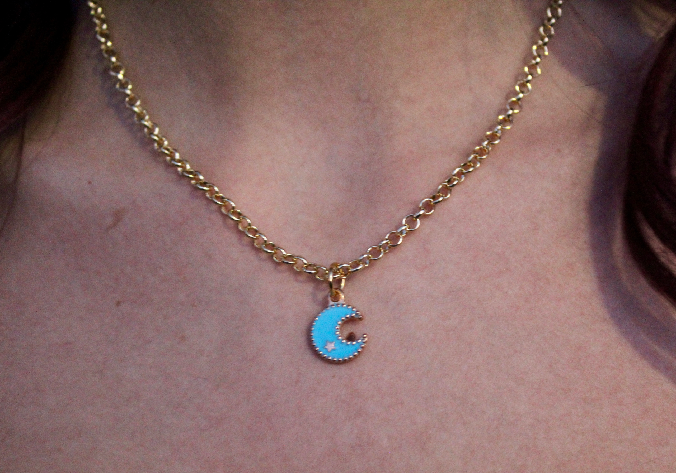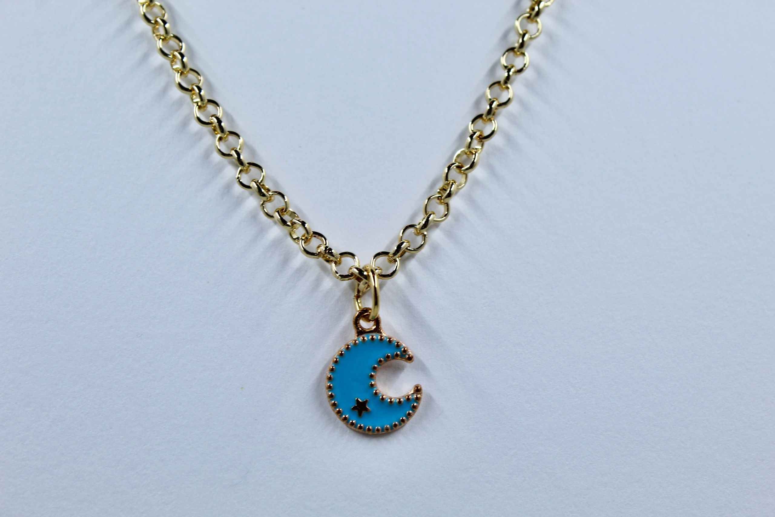 Design: The necklace features an adorable crescent moon charm, filled with a beautiful sky-blue enamel and accented with a tiny, sparkling gold-tone star. The moon’s silhouette is bordered by a delicate gold-tone trim, making the colors pop beautifully against the metal.