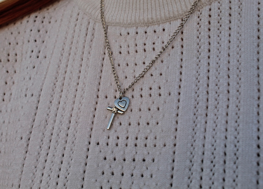 Meaningful Duo: The necklace features a simple, polished silver-toned cross charm paired with a delicate heart charm that has an inlaid cutout heart detail. The two elements hang together beautifully, symbolizing the core values of spirituality and love.