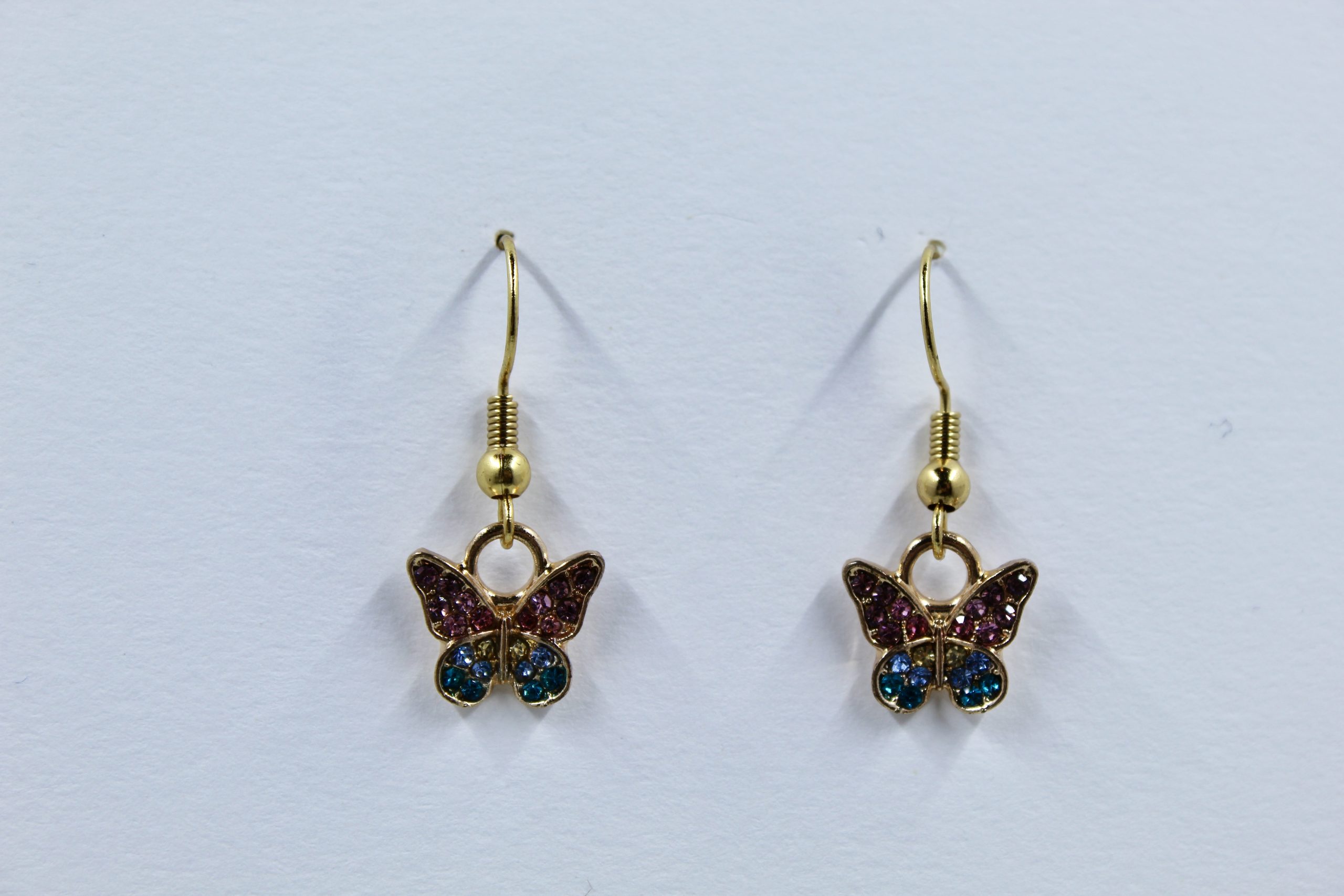 • Design: Each earring features a butterfly charm completely paved in shimmering rhinestones. The wings are set in a beautiful two-tone pattern: fuchsia/amethyst on the upper wings and a brilliant teal/sapphire blue on the lower wings. The gold-tone metal setting adds a warm, luxurious contrast to the sparkling colors.