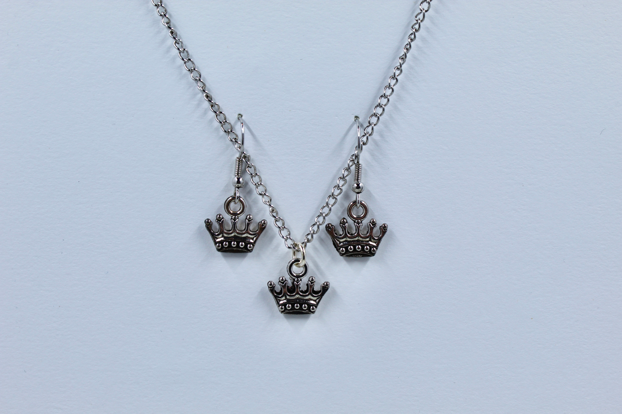 • Drop Earrings: Two coordinating crown charms dangling from comfortable silver-toned fish hook wires.